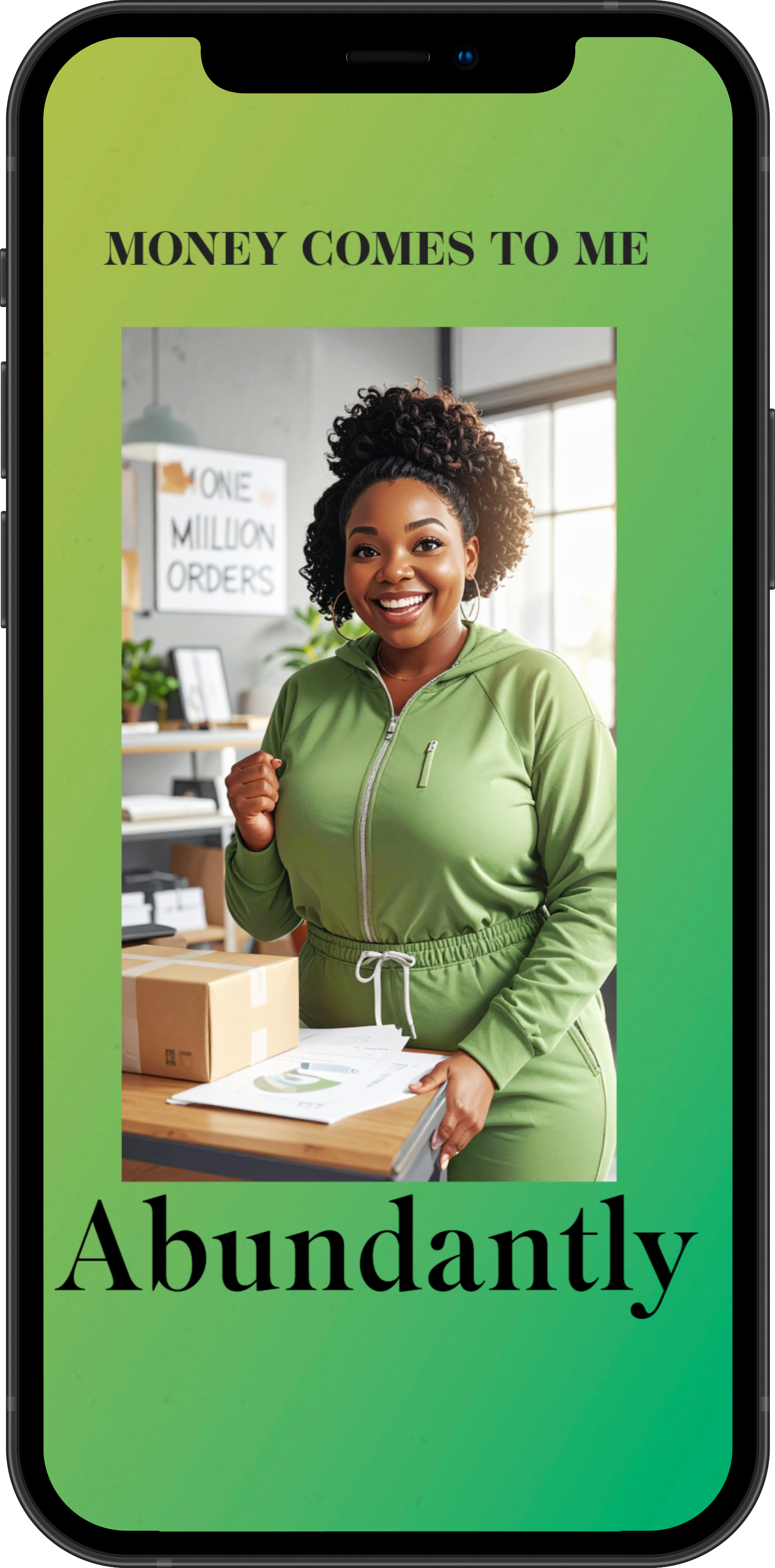Step boldly into your new era of abundance. This inspiring mobile wallpaper captures a powerful moment—a woman standing confidently in her thriving business, surrounded by signs of success and an overflow of orders, including a banner celebrating over one million sales. The affirmation “Money Comes to Me Abundantly” is more than words—it’s a daily declaration of faith, gratitude, and prosperity in motion.